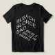 A bold and edgy t-shirt design featuring the words "BLEACH," "BLONDE," "BAD," "BUILT," and "BODY" arranged in a dynamic, 3D-like pattern. The overlapping and angled text creates a visually striking and modern aesthetic. The use of a neutral grey colour palette adds a touch of sophistication while maintaining a strong impact.