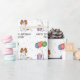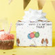 Cute birthday theme design featuring Destei's original cartoon illustration of a cute blenheim colour Cavalier King Charles Spaniel breed dog. Next to the dog there are colourful birthday balloons tied on a dog bone and a purple and yellow colour present box. The background has a playful pattern of colourful pastel confetti on a white background. There is also a personalizable text area.