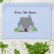 A lovely cosy tudor style house with a grey roof and black front door. Trees in the yard. Says 'Bless This Home'