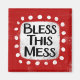 "Bless This Mess" is a cute text design in red with black text, along with a white accent shape and white textured whimsical dots surrounding it.