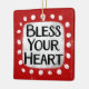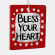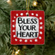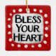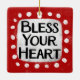 "Bless Your Heart" is a cute text design in red with black text, along with a white accent shape and white textured whimsical dots surrounding it.