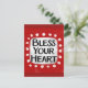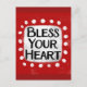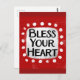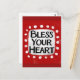 "Bless Your Heart" is a cute text design in red with black text, along with a white accent shape and white textured whimsical dots surrounding it.