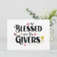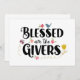 Thank someone with this beautiful hand lettering and calligraphy typography design featuring the message, "Blessed are the Givers." Design appears with colourful and fun bird, butterfly, and floral accents. Back has this fully-editable message, "They share their gifts freely and selflessly, because their spirits are kind, generous, and full of light. Because you are one of those people, my life is richer and more beautiful. Thank you."