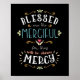 Beautiful Beatitudes poster featuring hand lettering style and design ornaments and accents surrounding typography on dark background includes the words, "Blessed are the Merciful, for they be shown mercy." This beloved scripture is an excerpt from Jesus' sermon on the Mount in Gospel of Matthew, Chapter 5.