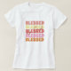 A trendy & colourful religious design. A retro font is used for "blessed" stacked in orange, peach, yellow, & pink. A script font is used for "by God" in a deep orange.