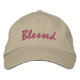 Blessed embroidered in pink on a khaki coloured hat. Hat colour and text colour can be customised.