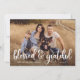 Chic Thanksgiving photo card featuring your full-bleed horizontal photo with "blessed & grateful" in a white, hand-lettered script overlay. Personalise the unique Thanksgiving card by adding your name & the year. The card reverses to feature a Farmhouse-style white foliage pattern against a beige background.