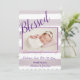 Sweet girly “Blessed” soft pastel purple stripe with newborn photo placement. Add baby name and proud parents and you have an adorable birth announcement to introduce your sweet baby girl. I added a special accent in this design by placing tiny bows to separate date of birth.