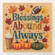 Celebrate the warmth of fall with this cheerful "Blessings Abound Always" design, bursting with cosy seasonal vibes. Surrounded by vivid autumn leaves in shades of crimson, gold, and burnt orange, this playful composition features plaid-patterned typography that radiates rustic charm. The inclusion of pumpkins, a classic football, and a whipped cream-topped fall drink adds a nostalgic and festive touch, perfect for anyone who loves crisp afternoons and pumpkin spice everything. The rich colours and joyful theme make this design ideal for autumn gatherings, Thanksgiving, or simply to embrace the spirit of gratitude. Styled with a modern country flair and playful visual layering, this artwork captures the essence of the fall season in a fun, heartwarming way. AI generated artwork.