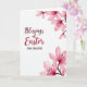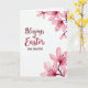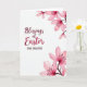 This greeting card features a white background with two clusters of pink blossoms that frame the message like a gentle embrace 🌷. One floral arrangement sits in the upper right, and the other balances it in the lower left, creating a quiet, friendly symmetry. The petals fade from a pale blush at the edges into deeper rosy tones toward the centers, where the color gathers like a tender blush. Fine, dark stamens stretch outward with tiny dotted tips, adding small details that feel careful and affectionate. Centered on the page, the main line of text reads “Blessings at Easter” in a flowing, decorative letter style in deep maroon, drawing the eye first. Just below it, “DEAR DAUGHTER” appears in uppercase serif lettering in the same maroon shade, set smaller and neatly aligned under the main phrase 🐰. The upper-right blossoms angle slightly inward toward the words, and the lower-left flowers mirror that tilt with matching pink gradients and dark dotted stamens.