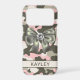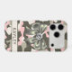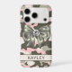 Customize this blingy pink, green and cream camouflage iPhone 17 pro case with an olive green satin bow with a diamond center and your name in a trendy modern CAP font in dark green on cream. It's so girly, blingy and chic! Perfect for any country girl!