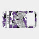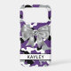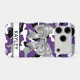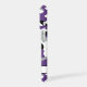 Customize this blingy purple, black, gray and white camouflage iPhone 15 pro case with a silver satin bow with a diamond center and your name in a trendy modern CAP font in black on white. It's so modern, girly and trendy! Perfect for any country girl!
