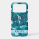 Customize this blingy teal camouflage iPhone 17 pro max case with a dark teal satin bow with a diamond center and your name in a trendy modern CAP font in dark teal on light teal. It's so modern, girly and trendy! Perfect for any country girl!