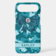 Customize this blingy teal camouflage iPhone 15 pro max case with a dark teal satin bow with a diamond center and your name in a trendy modern CAP font in dark teal on light teal. It's so modern, girly and trendy! Perfect for any country girl!
