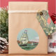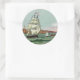 This antique image shows an elegant ship at full sail leaving the harbour. The colourful sky of blue and orange is a soothing compliment to the blue green water. It is ready for your personalisation.