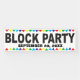 Block party street banner with custom text line - edit to add date or other information for your party. Colourful pennant border at top and bottom. Be sure to order the Outdoor Banner style if you will be hanging this outside.