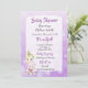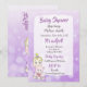 Blonde Baby Girl with Teddy Bear Baby shower invitations with purple and white polka dots and bows.