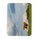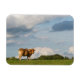 Rectangular photo magnet with a Blonde d'Aquitaine cow looking towards the viewer under some clouds in a meadow in the Dordogne region in France.