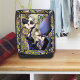 Blonde fairy wearing purple and red in a floral geometric pattern of green, ornage, lavender and pink,