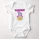 A cute design for summer, features a blonde haired girl in bathing suit and ring coming down the water slide and hot pink and blue text that reads SUMMER! Summer T-shirts, bodysuits, bibs, mugs, cards, bags, stickers, keepsakes, pillows, and much more.