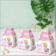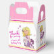 Bright graphic pink with scallop stripes and graphic blonde hair girl holding a lucky white bunny rabbit and gift, thank you favour birthday gift boxes. Ideal for your girls birthday favours. Personalise with your own name and birthday age. Currently reads Thanks for coming to Justine's 9th Birthday Party. Original art and design by Sarah Trett.