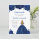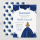 This Quinceanera invitation features faux glitter navy blue floral flowers and a beautiful princess with blonde hair and an elegant dress. This is perfect for a Quinceanera birthday party.