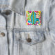 A blonde haired surfer boy with a blue surfboard surrounded by tropical plants of various bright colours on a button that matches our Blonde Surfer Boy invitations, postage stamps, and stickers!