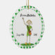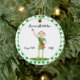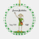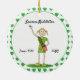 Customizable name, troop number and year for this cute, blonde, junior in ponytails wearing a green uniform and sash, red cookie box, standing in grass waving. A green heart shape pattern borders the ornament.