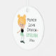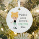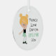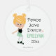An adorable tap dancer ornament with her blonde hair in two buns wears a black leotard, white stockings and a mint green skirt and a pair of tap dancing shoes. The words Peace Love Dance with a pink heart. Personalise it with a little dancer's name and customise it with the year of this cute gift for a dancer.