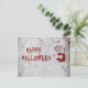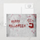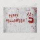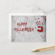 Scary horrific Halloween illustration featuring a bloody handprint and blood splatter on a grungy background.