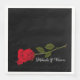 The Gothic wedding paper napkins are designed to be elegant and mysterious. It is completely black and has an elegant look. The font is in a delicate, almost white shade of grey that contrasts with the dark background. At the bottom there is a red rose and a bit of blood in a small pool.