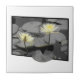This out of frame image features two delicate water lilies in soft, pale-yellow hues, standing out vividly against a backdrop of muted, grayscale lily pads and water. The flowers extend beyond the black-bordered frame, creating a dynamic, almost three-dimensional effect. The contrast between the vibrant blooms and the subdued surroundings highlights the gentle beauty and tranquility of the scene, evoking a sense of calm and quiet elegance.