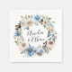 Our elegant personalised paper napkins feature a floral wreath of antique white and indigo blue watercolor roses with muted green leaves. Personalise the napkins by adding your names for a design that will impress your guests! Designed to coordinate with our Blooming Beauty wedding collection.