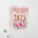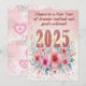 A charming New Year's greeting card featuring large glittery numbers "2025" surrounded by delicate pink and blue floral illustrations. The text "Cheers to a New Year of dreams realised and goals achieved" is written in a elegant script at the top, all set against a gentle pink gradient background.