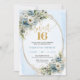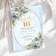 Celebrate a milestone moment with this elegant Sweet Sixteen invitation, featuring a refined watercolor design of dusty blue florals blended with soft white flowers and fresh eucalyptus greenery. Framed by a shimmering gold glitter border and paired with graceful script lettering, this invitation sets a sophisticated tone for a truly unforgettable Sweet Sixteen, Sweet 16th, or 16th birthday celebration.