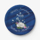 Beautiful white rose blossoms with tiny blue bell flowers and pink buds on custom paper plates for 65th wedding anniversary party. Sapphire blue drape backdrop give it an elegant touch. Personalise year and names in template provided. ©AnuraDesignStudio All Rights Reserved