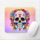 a vibrant and captivating artwork that blends the elegance of floral motifs with the bold symbolism of a sugar skull. Inspired by the traditions of Día de los Muertos, this design features an intricately decorated skull surrounded by a vivid bouquet of colorful flowers. Set against a radiant gradient background.