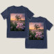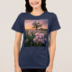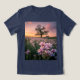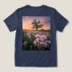 This t-shirt features a digital photo of a sprawling field brimming with vibrant wildflowers bathed in the warm hues of a springtime sunset. In the foreground, a cluster of delicate pink and lavender blossoms dance gently in the breeze, their petals illuminated by the golden light. An oak tree is silhouetted by the sunlit sky and a small wooden sign reading Welcome Home is near. The scene is bathed in a soft, ethereal glow, creating a sense of tranquillity and natural beauty. The t-shirt is a navy Bella Canvas Tri-Blend t-shirt.