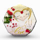 con fondo beige y rosa degradado y marco en forma de corazón dorado rodeado de brillo dorado y rosas rojas .