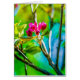 Closeup view of a cluster of red crabapple flowers inside a tree against colourful green, yellow, blue and pink background. Textured photography. Crab apple tree is a symbol of youth, joy and good magic. Greeting cards for anyone.