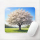 A blooming apple tree in the center of a green meadow under a clear blue sky during springtime