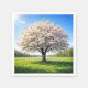 A blooming apple tree in the centre of a green meadow under a clear blue sky during springtime