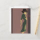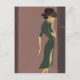 Blue-purple frames give the depth of this picture. Added with a violet background, the lady stands in a brighter space. The lady, however, looks sideward, which gives more distance and mystery. In a dark green dress, the figure is depicted slim and elegant, as if something flashed over her mind to stop her progress.