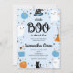 Celebrate Halloween with our Blue A Little Boo Baby Shower Invitation! This whimsical design features adorable ghosts, a playful cat, blue and orange pumpkins, a witch hat, and a broomstick, all set against a calming blue background. Perfect for a Halloween-themed baby shower, this invitation brings a touch of magic and fun to your special day. BBS494