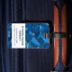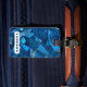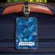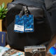 Luggage tag featuring an abstract, geometric pattern in shades of blue and your name. Contact information on the back.