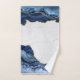 This custom bathroom towel set features a luxurious natural stone design. The background is a soft grey marble pattern. The hand and bath towels have navy blue agate with faux gold glitter accents printed on either end. The washcloth has the agate pattern printed on one side.