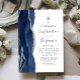 The left-hand edge of this elegant modern Confirmation invitation features a navy blue watercolor agate border trimmed with faux silver glitter. A faux silver foil cross appears above the customizable text, which combines handwriting, copperplate and italic fonts in charcoal gray on a white background. The reverse side features a matching navy blue and silver agate design.