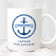 Cup featuring a dark blue nautical anchor surrounded by a rope border on a white background. Across the anchor is a light blue ribbon with a template field for your boat's name. Below is a template field for more custom text for example the captains name.