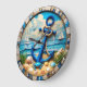 This circular wall clock features a vibrant beach scene with a large blue anchor, complete with rope, standing prominently in the foreground. The sandy beach is adorned with various seashells, a blue crab, and a red starfish. In the background, white sailboats cruise on calm blue ocean waters under a cloudy sky. The outer edge of the clock face has a rustic, wood-like border with blue accents.