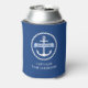 Can cooler featuring a white nautical anchor surrounded by a rope border on a dark blue background. Across the anchor is a light blue ribbon with a template field for your boat's name. Below is a template field for more custom text for example the captains name.